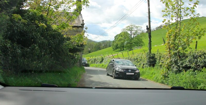 Then when I actually encounter oncoming traffic!!! I was catching a lift in a friend’s Renault when I snapped this pic through the windshield and the car’s warning siren was beeping hysterically because our “wing mirror” was scraping through the hedgerow camouflaging the stone wall behind it. I was glad not to be driving that day!