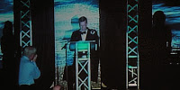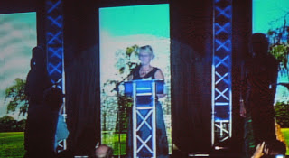 Another of my mentors, Susan May Warren, received a Carol Award for her long Historical Sons of Thunder…which brings to mind another interesting story. You’ll notice in the background of this picture, as well as in Chip’s, there are scenes. The scenes changed to depict the story lines of each winner’s novel. Music related to the title also played as the winner made his or her way to the podium. Susie thought the sound she was hearing was ocean waves and said so aloud, only to be answered with a crash of thunder. It wasn’t until another couple of awards were handed out that she realized why “thunder” crashed during her walk to the front. 😀