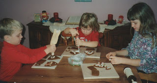 One thing I did with my children every year was bake and build gingerbread houses. This was a several day affair of shopping for the candy decorations, preparing the dough, rolling and shaping and baking it the next day, assembling and admiring, and then finally on Christmas Eve, nibbling. ~grin~