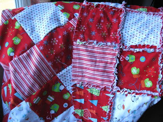 What do you think? It’s made of doubled flannelette squares so that both sides show the design. The back of the quilt (on the left) are smooth seams, while the front (right side of photo) have the seams and edges all clipped for a raggedy effect.