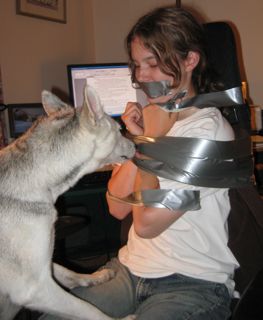 Bella did the duct taping because your daughter wouldn’t tell her where the peanut butter jar was hidden. Face licking torture is next until she gives up the goods.